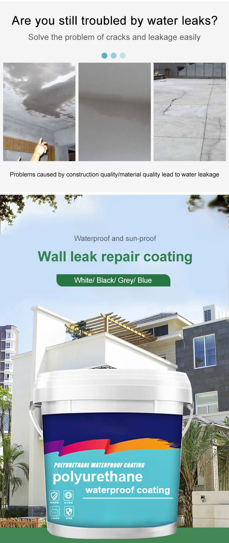 Polyurethane Waterproofing & Leakage Repairing Eco-Friendly Coating is a high-quality solution designed to protect and repair various surfaces from water damage and leaks. This eco-friendly coating is formulated with advanced polyurethane technology, providing long-lasting and reliable waterproofing performance. Whether you need to seal a roof, basement, or any other vulnerable area, this coating offers superior protection against water penetration and ensures a durable, watertight seal.